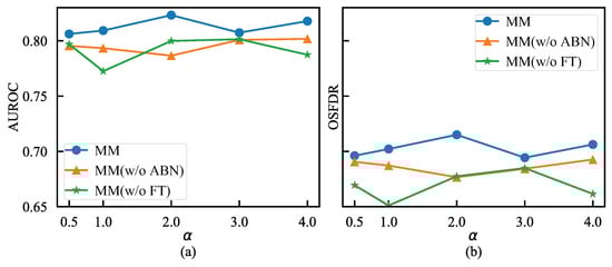 The ablation experimental results of the NSI-aided manifold mixup with or without ABN and FT under different . (a) The ablation experimetal results in terms of AUROCs. (b) The ablation experimetal results in terms of OSFDRs.