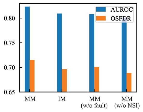 Mixups with Manifold and Normal State Information. We conducted an additional analysis of NSI-aided manifold mixup, examining scenarios with and without manifold assistance and with or without normal state information. We assessed the OSFD performance of SRPL, which incorporated NSI-aided Manifold Mixup (MM), Input Mixup (IM), the direct use of normal samples as unknown faults denoted as MM(w/o fault), and manifold mixup without the aid of Normal State Information denoted MM(w/o NSI). The results are presented in Figure 9. Compared to IM, MM demonstrated improved OSFD performance, as manifold mixups can be optimized to more effectively represent unknown-fault patterns, as detailed in Section 3.3. Furthermore, the primary distinctions between MM, MM(w/o fault), and MM(w/o NSI) lie in the incorporation of auxiliary information from known faults and normal samples, which enhances the reliability of virtual unknown samples. Overall, the results indicate that a manifold combination of known faults and normal samples can significantly enhance OSFD performance.