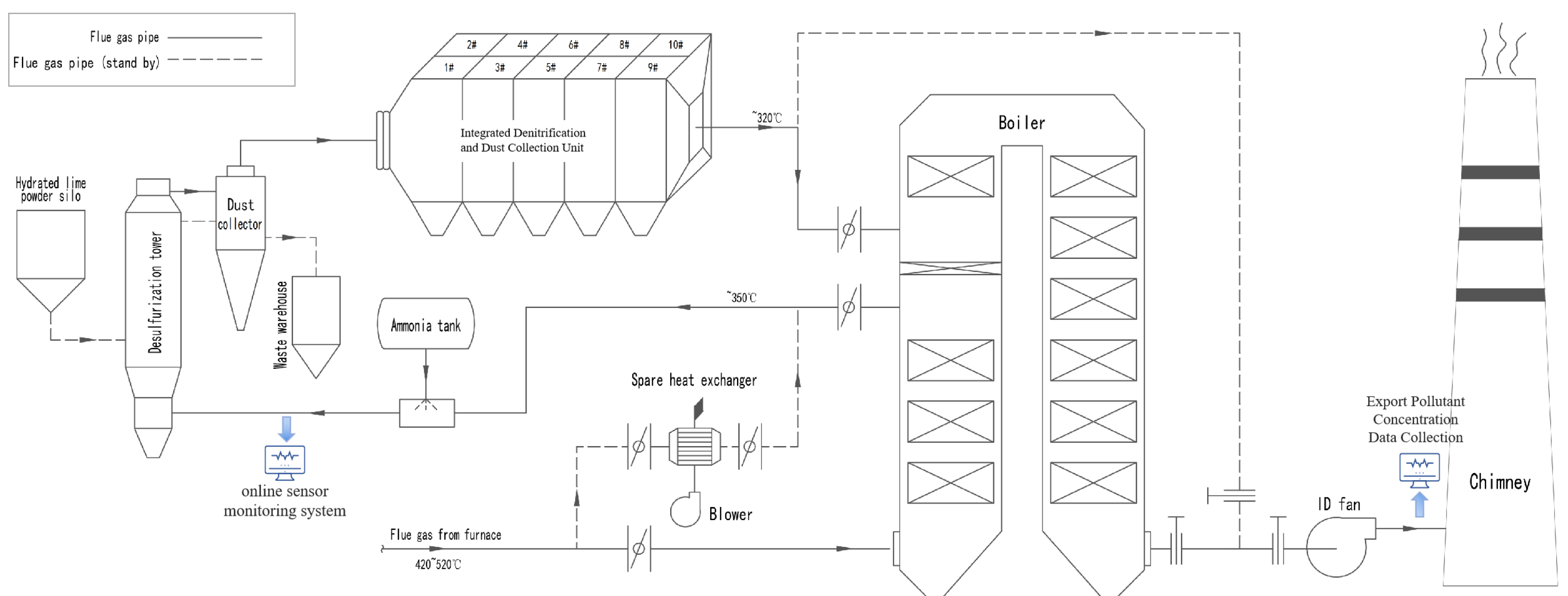 x and ammonia undergo selective catalytic reduction on the catalyst surface of the unit’s modular cells, producing nitrogen and water. Meanwhile, alkaline particulates in the gas stream form a filter cake layer that enhances desulfurization, and captured particles are collected through the ash-cleaning system. After completing this high-temperature desulfurization–denitrification–dust-removal process, the purified flue gas is drawn by an induced draft fan and finally discharged through the chimney.