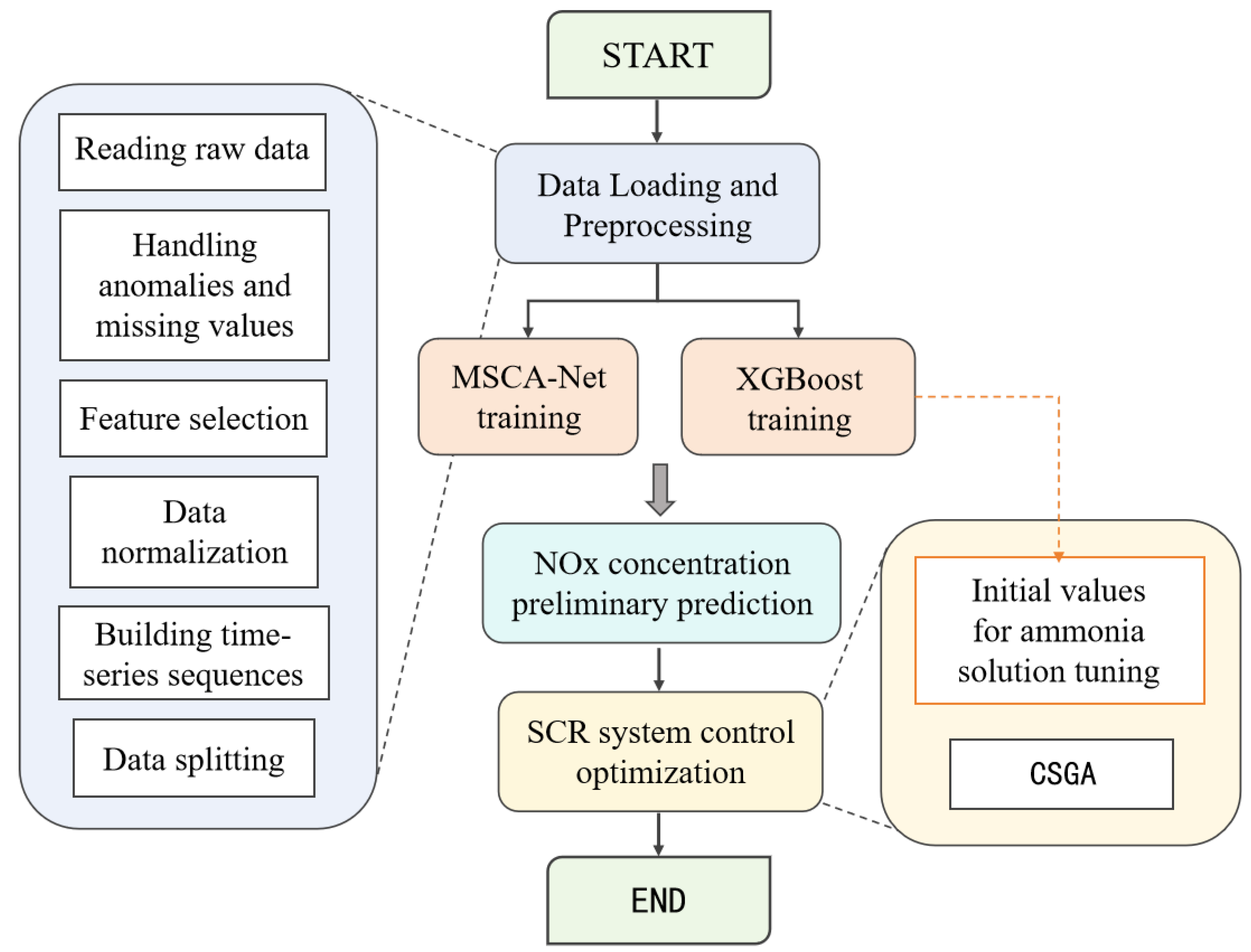 Figure 2. We introduce a three-tier synergistic architecture that integrates MSCA-Net, XGBoost, and CSGA to optimize ammonia flow and regulate NO