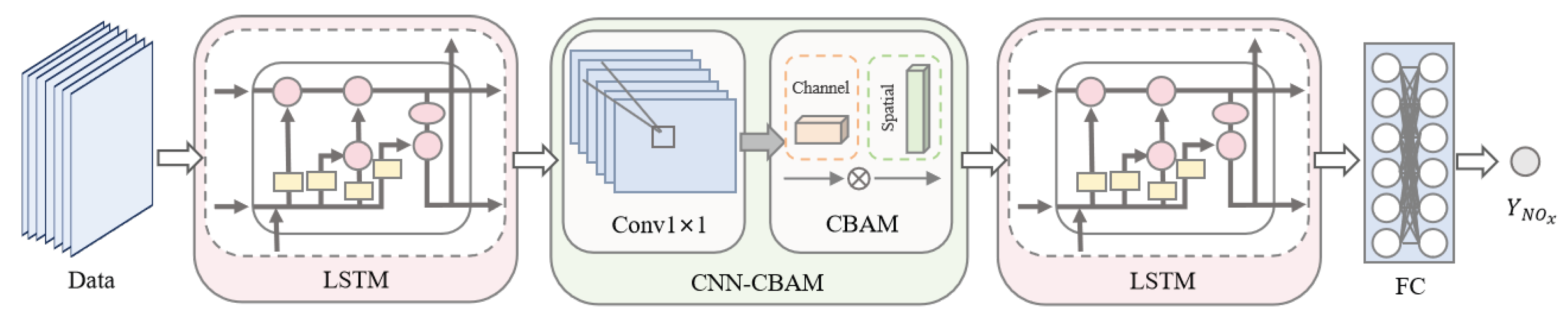 Figure 3. The MSCA-Net adopts a strictly sequential, end-to-end architecture, with the data flow designed to capture both global and local temporal–spatial dependencies. Specifically, the input multivariate time-series data are first processed by an initial LSTM layer, which captures long-term temporal dependencies and provides rich global contextual information for subsequent modules. Next, a one-dimensional convolutional layer extracts local spatial patterns from the LSTM outputs, strengthening the model’s ability to perceive correlations among neighboring feature points. The CBAM attention module is then applied to the convolutional feature maps to adaptively reweight channels and spatial locations, highlighting features that are highly correlated with NO