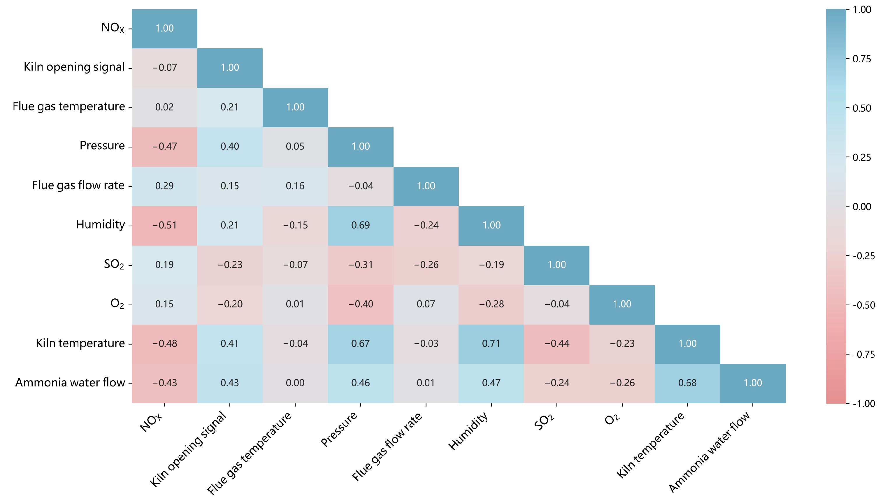 In addition to the online sensor monitoring data, the dataset also includes pollutant concentration analyses. Specifically, the NOx concentration (mg/m3) was measured at the chimney outlet with a one-minute sampling frequency, providing high-resolution monitoring of exhaust gas emissions. The data collection period spanned from 9 April 2024, to 30 March 2025 (356 days in total), yielding approximately 512,640 data samples. The data encompasses various operating conditions of the glass melting furnace, providing a reliable data foundation for the subsequent optimization of ammonia water flow to achieve low NOx emissions (<50 mg/Nm3).