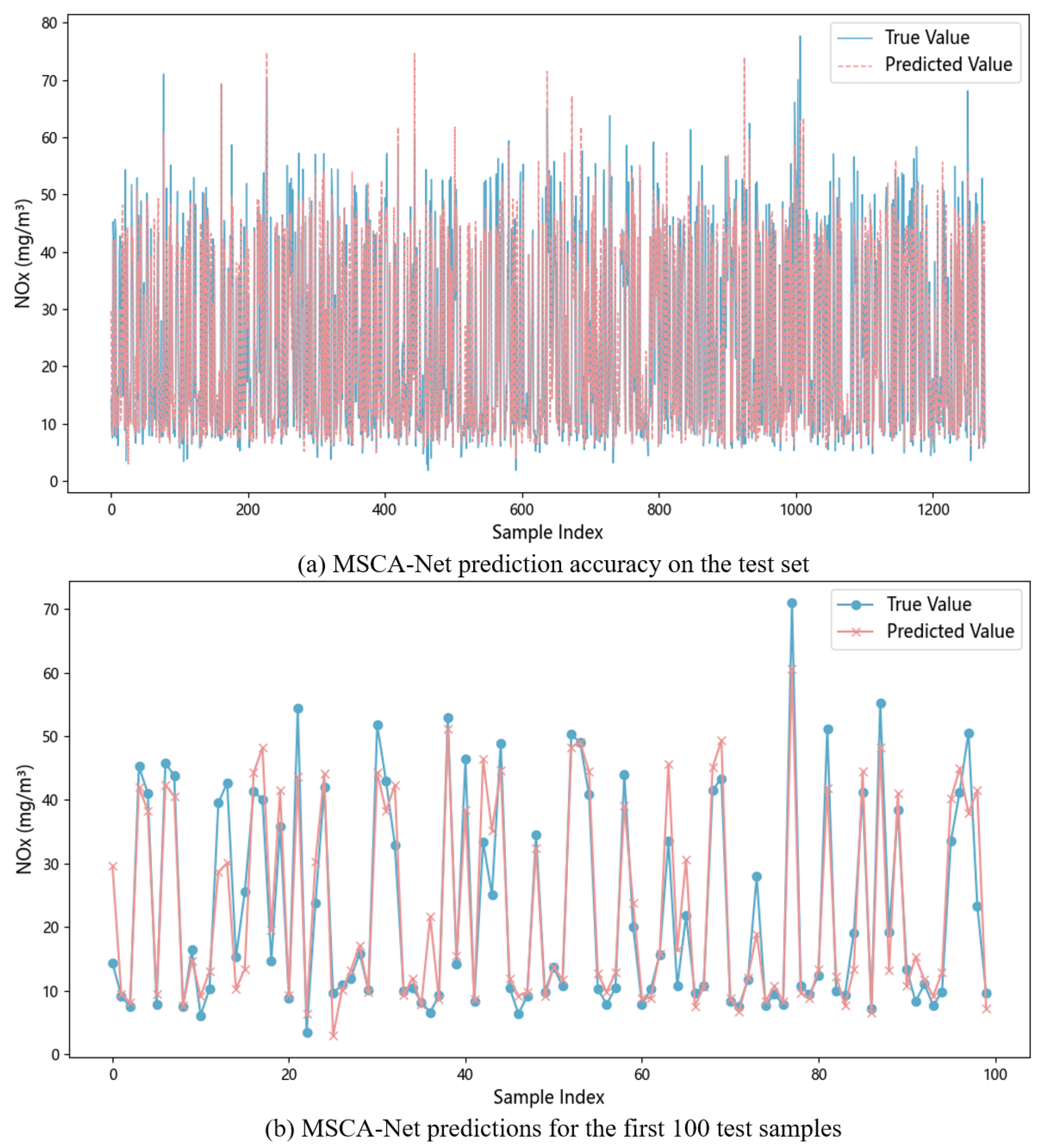 To address the challenges of multivariable coupling, strong nonlinearity, and complex operating conditions in industrial flue gas treatment, the MSCA-Net was developed, significantly enhancing the accuracy and robustness of NOx concentration predictions at the system outlet.