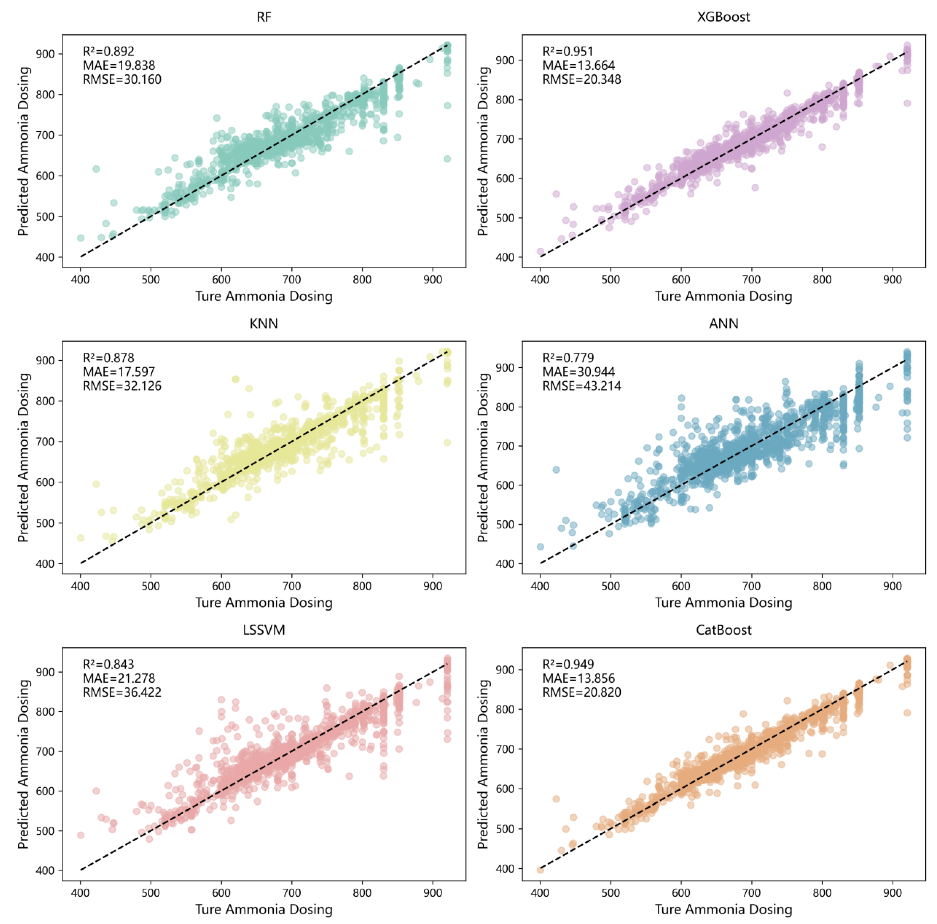 x compliance rate, average ammonia consumption, and exceedance ratio, providing a holistic assessment of the denitrification system in terms of environmental compliance, economic efficiency, and operational reliability. At the predictive model level, MSCA-Net and XGBoost were quantitatively evaluated using three commonly adopted metrics: coefficient of determination (R