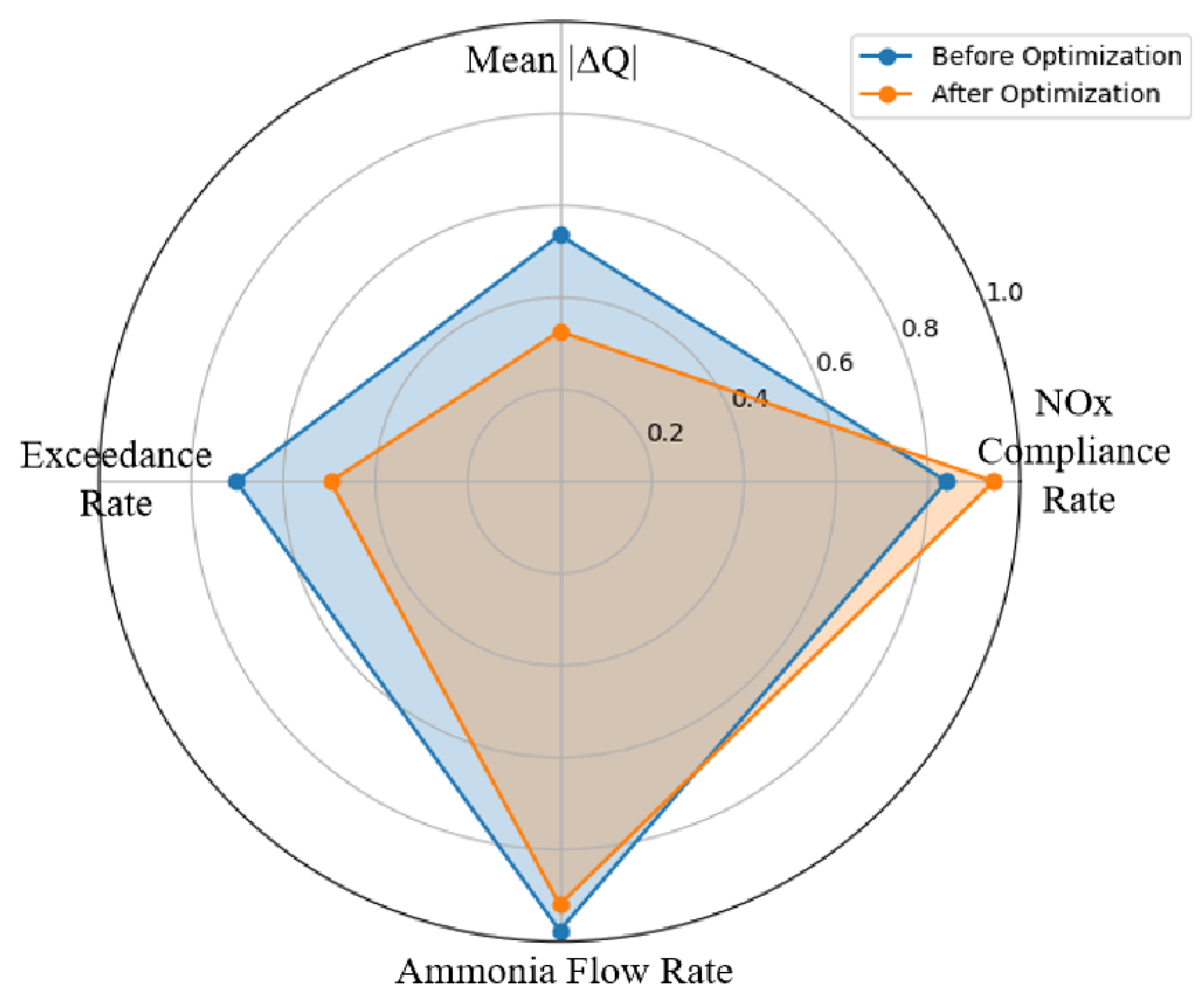 To validate the effectiveness of the proposed framework, we evaluated multiple key performance indicators, including NOx compliance rate, average ammonia consumption, and exceedance ratio. Experimental results demonstrate that the integrated optimization framework significantly outperforms existing benchmark methods in both NOx concentration prediction accuracy and multi-objective dynamic optimization. These findings confirm the superiority, adaptability, and practical utility of the proposed strategy for denitrification in complex industrial flue gas environments.
