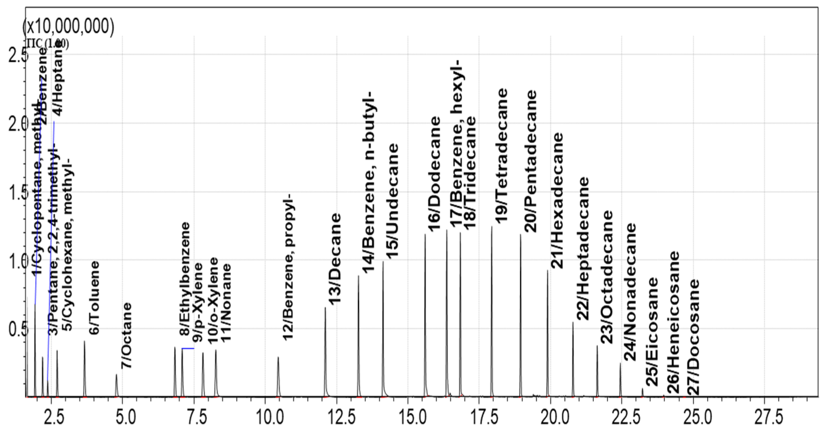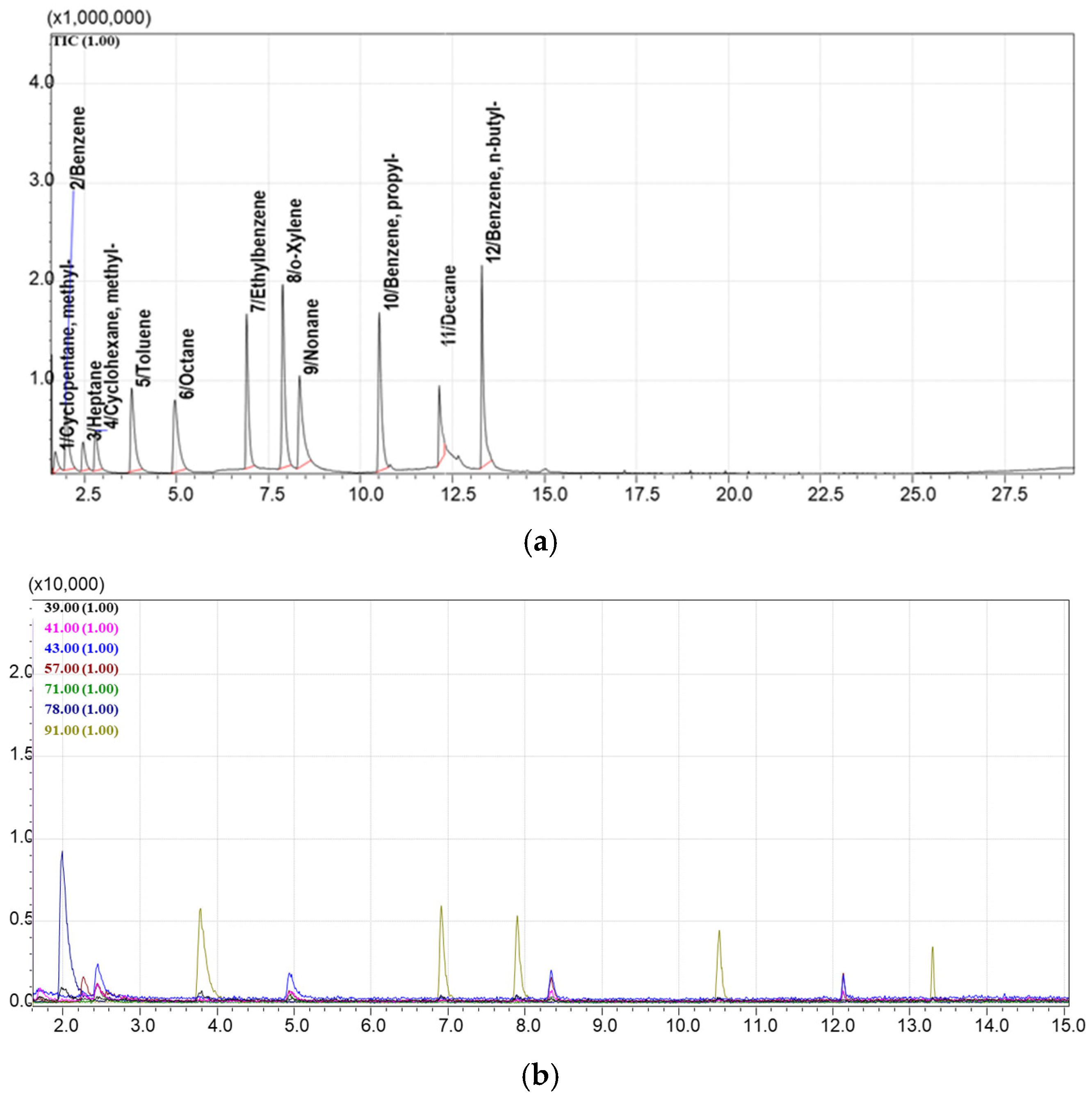 3.5. Method for GCMS Separation and Detection of Hydrocarbon VOCs Adsorbed on Sorbents