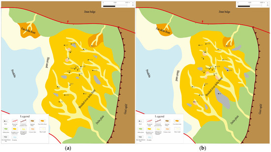 Sedimentary microfacies diagram of the Jingjingzigou Formation of Satan 1 block ((a) P2jj1 sand layer; (b) P2jj2 sand layer).