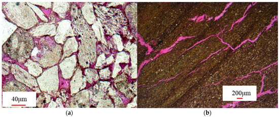 In addition, structural fractures, structural–solutionary fractures, and intergranular fractures were also observed. The main fractures are diagenetic shrinkage fractures, which are mostly isolated and discontinuous, developing along the particle edges. Some of the fractures contain oil, improving the reservoir permeability and providing channels for fluid migration. The characteristics and genesis of the microscopic fractures have been well-studied in the adjacent areas, providing a reference for the study of fractures in this area [27].
