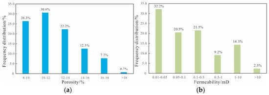 Histogram of reservoir property distribution of the Jingjingzigou Formation in Satan 1 block ((a) porosity distribution histogram; (b) permeability distribution histogram).