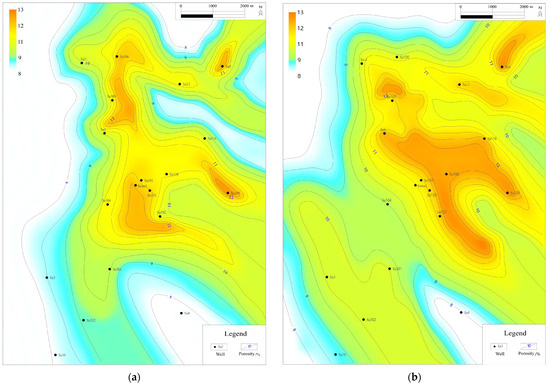 Equivalent contour map of porosity of the small layers in the Jingjingzigou Formation of Satan 1 block ((a) layer P2jj1−1; (b) layer P2jj2−1).