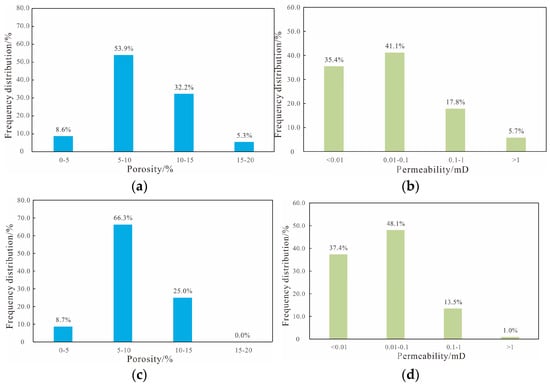 Histogram of physical property distribution of different sedimentary microfacies of the Jingjingzigou Formation in Satan 1 block ((a) histogram of porosity distribution in the subaqueous distributary channel facies; (b) histogram of permeability distribution in the underwater distributary channel microfacies; (c) histogram of porosity distribution in the estuarine dam microfacies; (d) histogram of permeability distribution in the estuarine dam microfacies).
