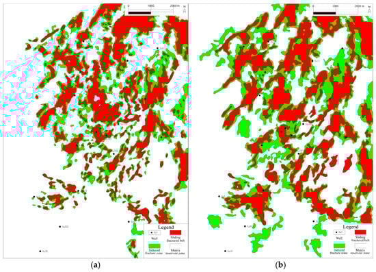 Distribution map of favorable fracture areas of Jingjingzigou Formation in Satan 1 block ((a) P2jj1; (b) P2jj2).