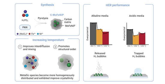 Differences in HER performance among the catalysts obtained at different pyrolysis temperatures can be attributed to structural and compositional changes. XRD and EDX analyses revealed that the increasing pyrolysis temperature promotes both improved crystallization and interdiffusion and mixing of metallic species within the phosphide phase of C-MoFeNiP (