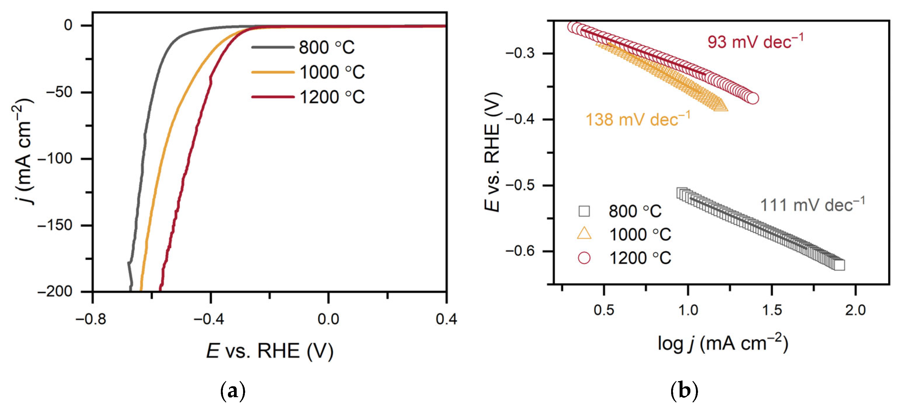 A closer examination of the Tafel slopes provides additional mechanistic insight. Depending on the synthesis temperature, the Tafel slopes decreased with increasing pyrolysis temperature from around 120 mV dec