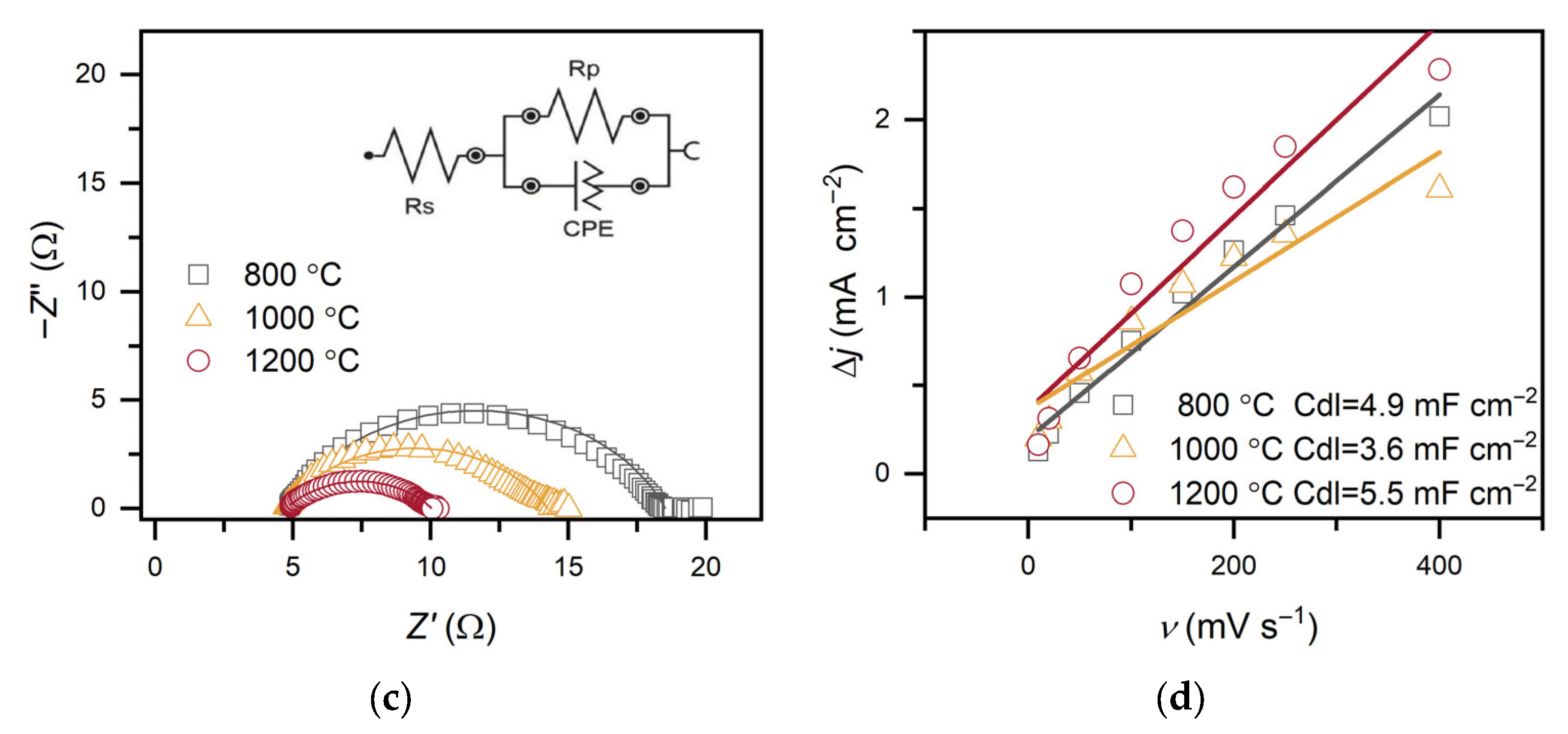 Overall, the combined electrochemical analyses demonstrate that the HER performance of C-MoFeNiP catalysts is strongly influenced by pyrolysis temperature, which governs the crystalline phase and composition of the metal phosphides, the kinetics of the Volmer step, and the charge-transfer properties at the catalyst-electrolyte interface.