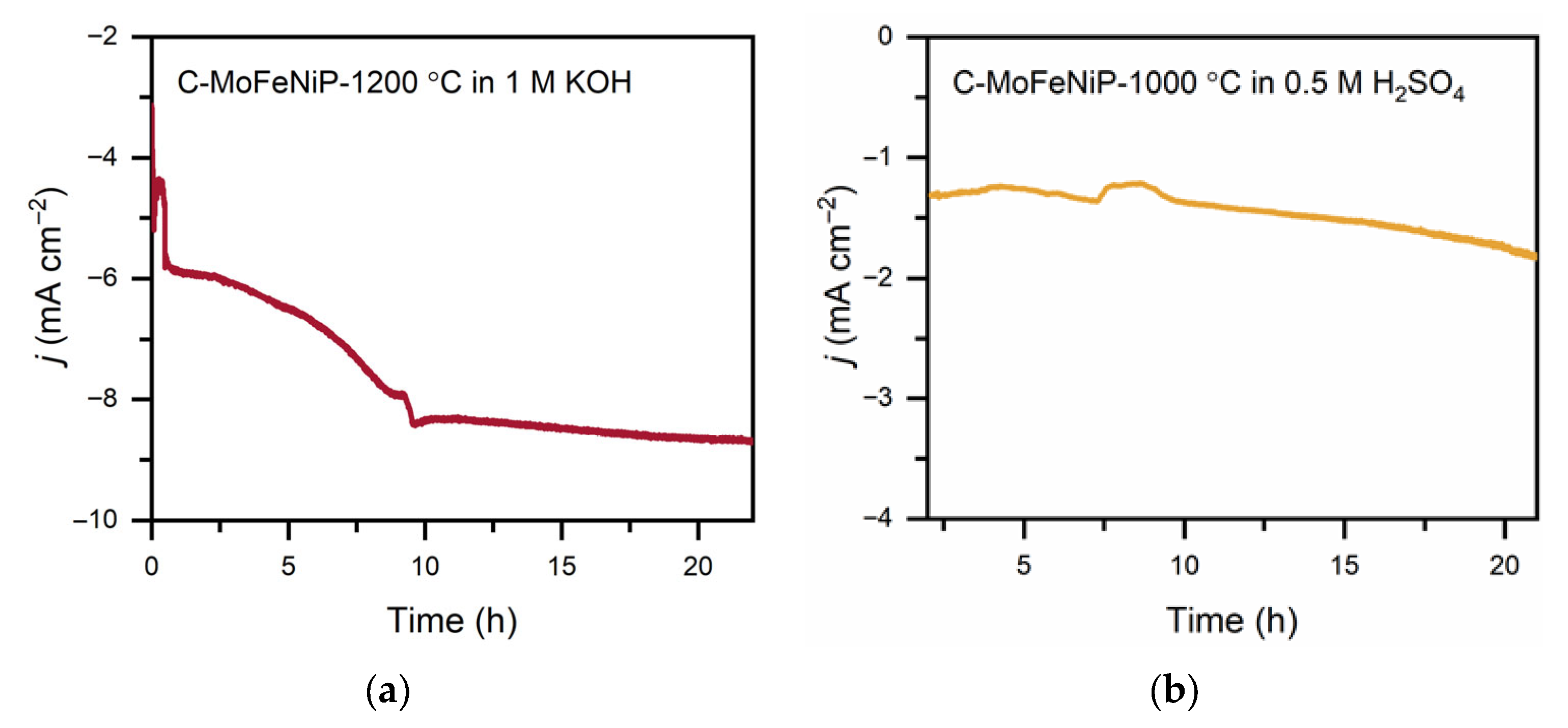 For the stability measurements, the best-performing catalyst in each environment was selected to demonstrate durability under the respective conditions. Chronoamperometric stability tests of C-MoFeNiP-1200 in alkaline media revealed an increase in current density during the initial 10 h, followed by steady-state behavior. In acidic media, the chronoamperometric test revealed a stable current response over time, indicating good electrochemical stability of C-MoFeNiP-1000 (