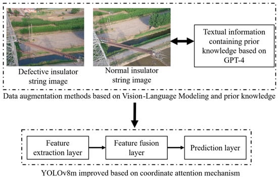 To address the above issues, this paper proposes a lightweight model for insulator defect detection based on Vision–language modeling and prior knowledge. The model generates defective insulator samples based on prior knowledge and Vision–language modeling to ensure the authenticity of the samples. An improved YOLO model is used to construct a lightweight model for insulator defect detection, which greatly reduces the computational cost while ensuring detection accuracy, thereby meeting the requirements of real-time detection. The main contributions of this paper are as follows: