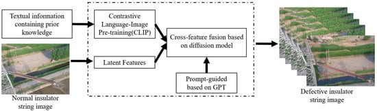 In the above equation, represents the embedded vector of prompts. This paper employs GPT to generate prompt-guided text. Based on the text generated by GPT, the defect types of insulators are fine-tuned to enrich the defect features of insulators. The Data Augmentation model framework proposed in this paper is shown in the figure below.