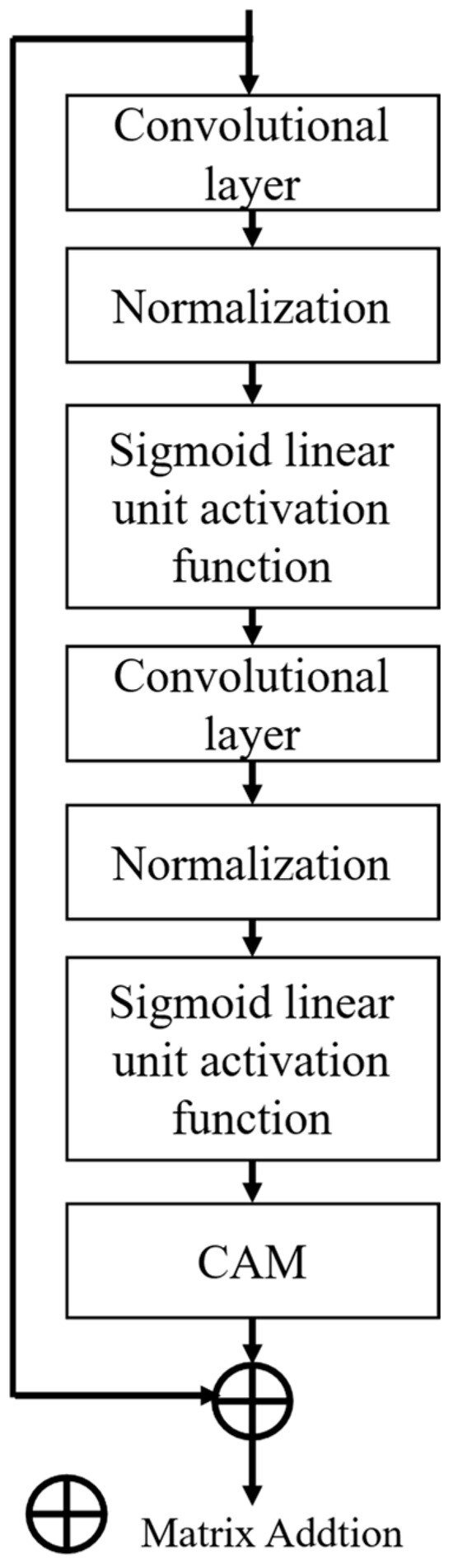 In the above equation, represents all channels of the entire feature map. represents the feature slice corresponding to the channel. skips convolution and retains the original features. perform convolution and CAM calculations for feature extraction and attention weighting. Finally, the unprocessed half-channel will be concatenated with the half-channel that has undergone convolution and attention processing in the channel dimension.