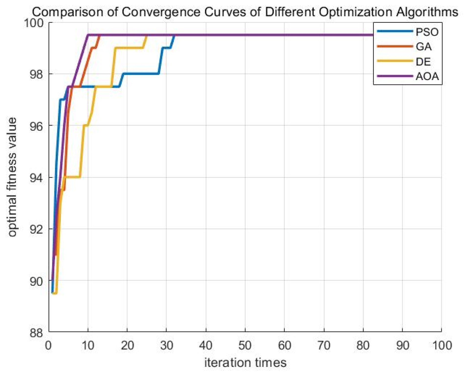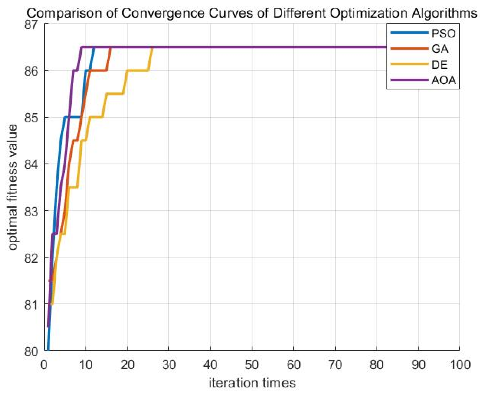 - AOA iterative optimization: First, select the individual with the highest fitness in the current population as xbest, and record its denbest, volbest, and accbest. Then, update the density and volume of individuals using Equation (3), calculate TF and d using Equation (4). Subsequently, perform global exploration and local exploitation to update the population positions. Calculate the fitness of the new population and update the global best solution.