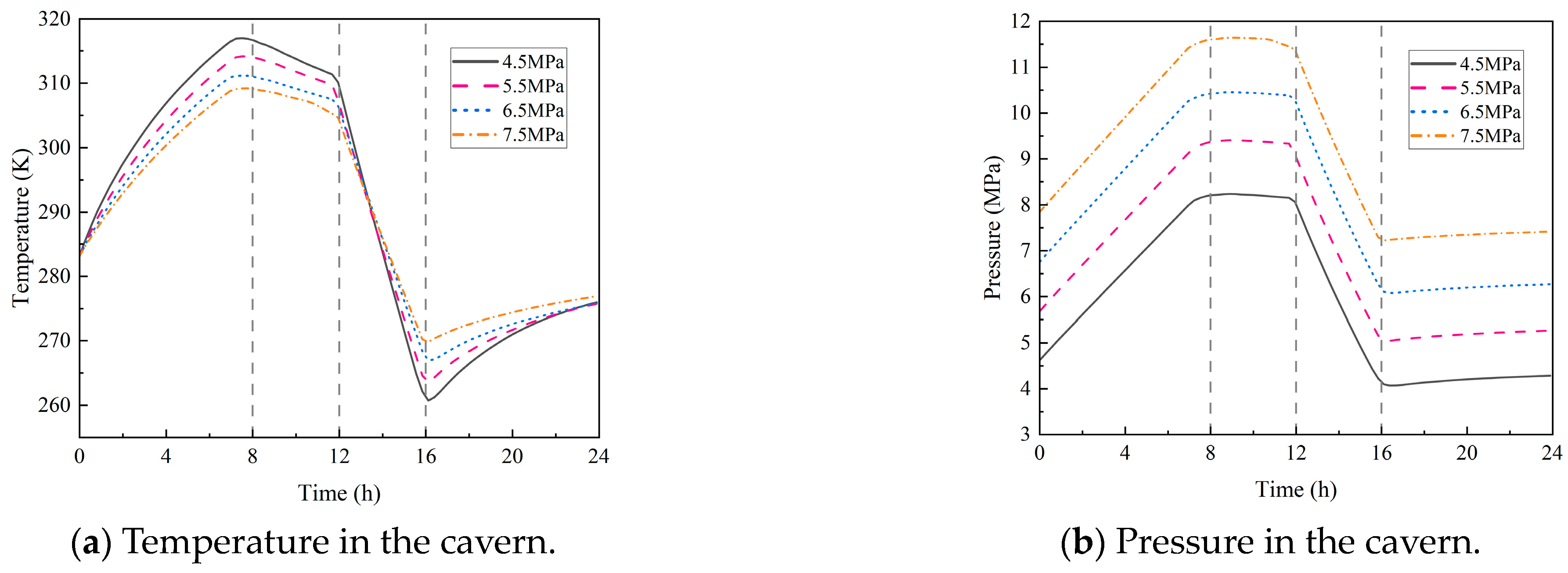 4.1.1. Temperature and Pressure Evolution Within the Cavern