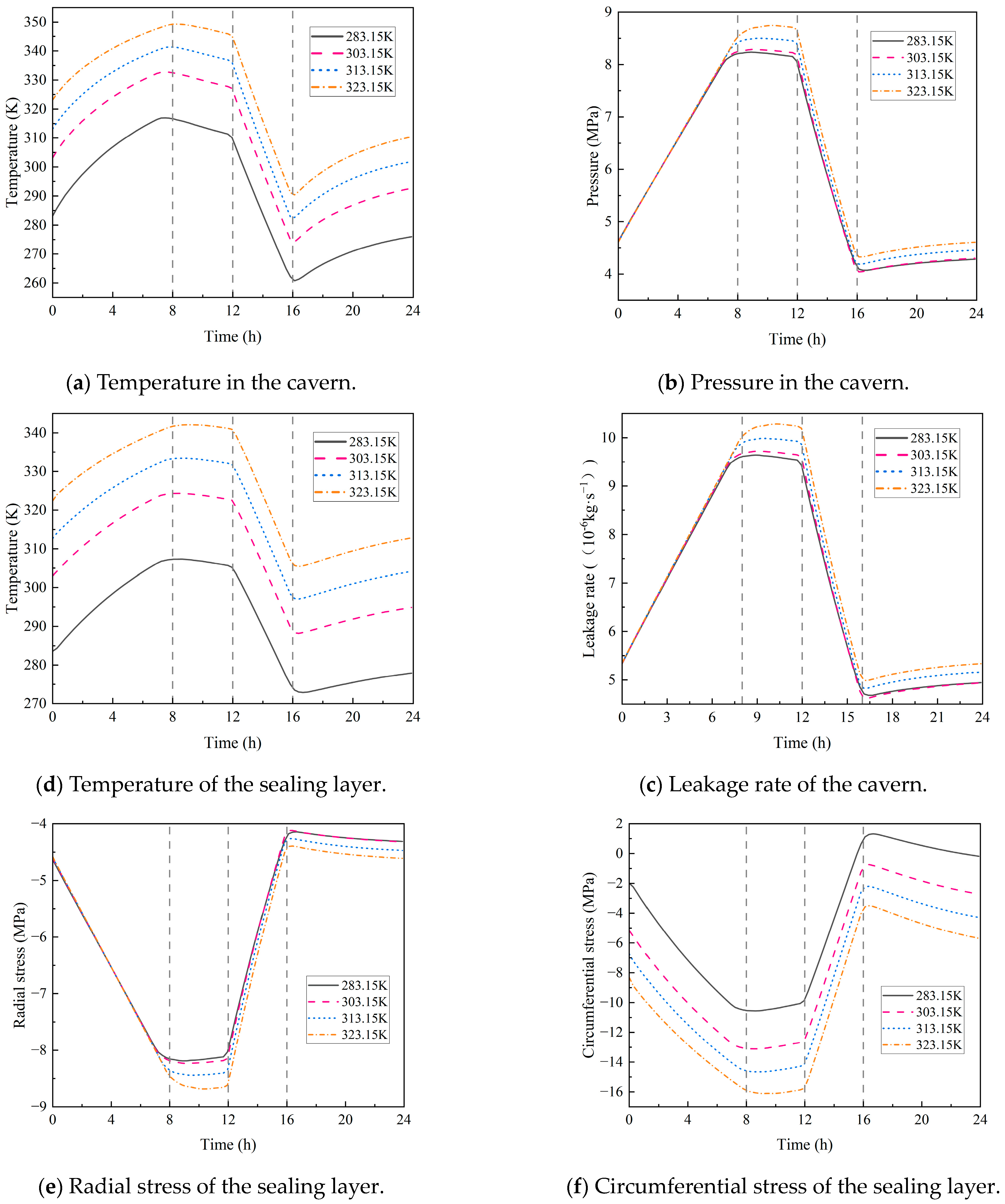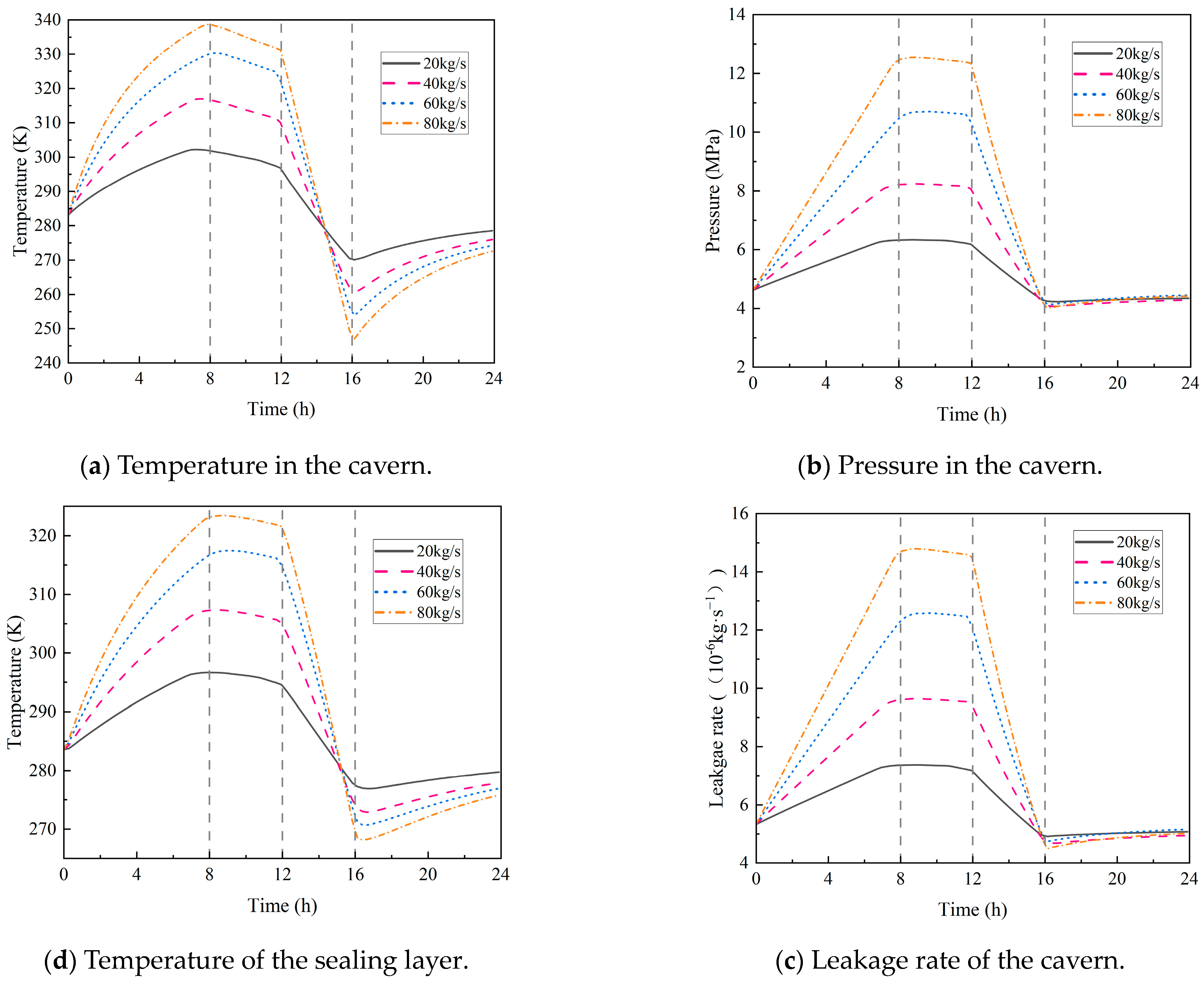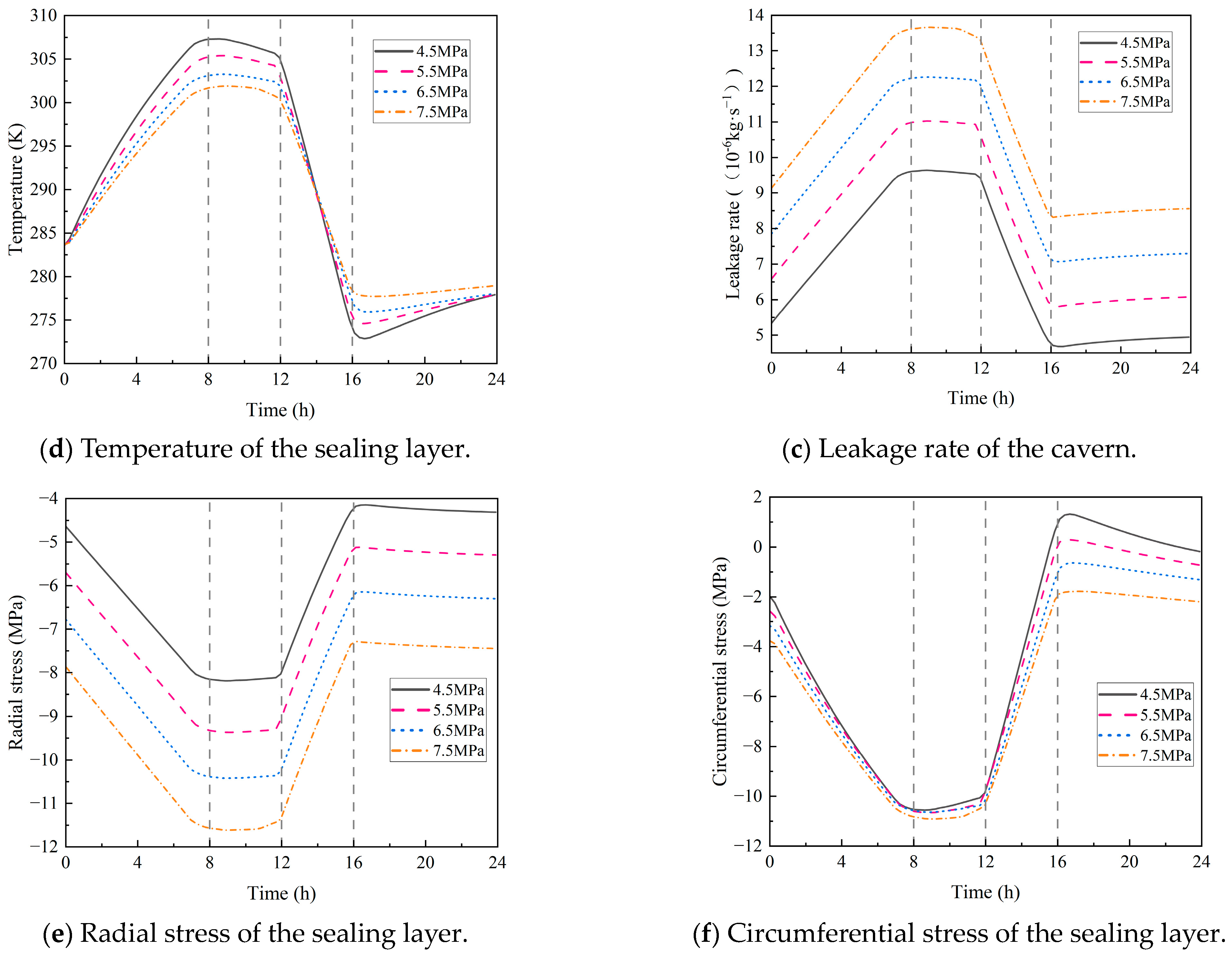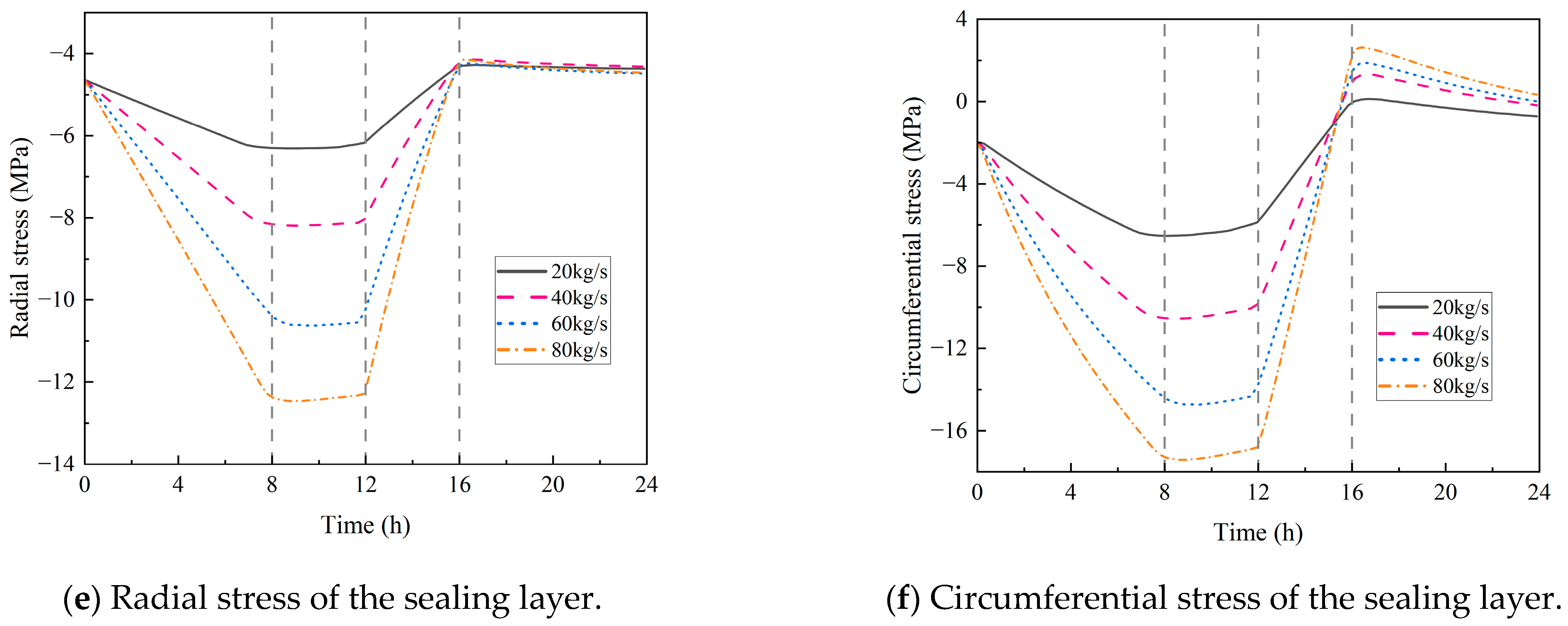 - During the injection phase (0–8 h), continuous hydrogen injection synchronously raises cavern pressure and temperature, and the pressure drives a slow upward leakage rate. In the first storage phase (8–12 h), pressure and temperature stabilize, and the leakage rate peaks with small fluctuations. In the production phase (12–16 h), hydrogen discharge lowers cavern pressure and temperature significantly, reducing the leakage rate slowly. Although the sealing layer may develop local tensile stress (due to the thermal expansion coefficient difference with the support structure), leakage stays controlled. In the second storage phase (16–24 h), cavern temperature and pressure rise slowly with tiny variations, and the leakage rate remains stable;