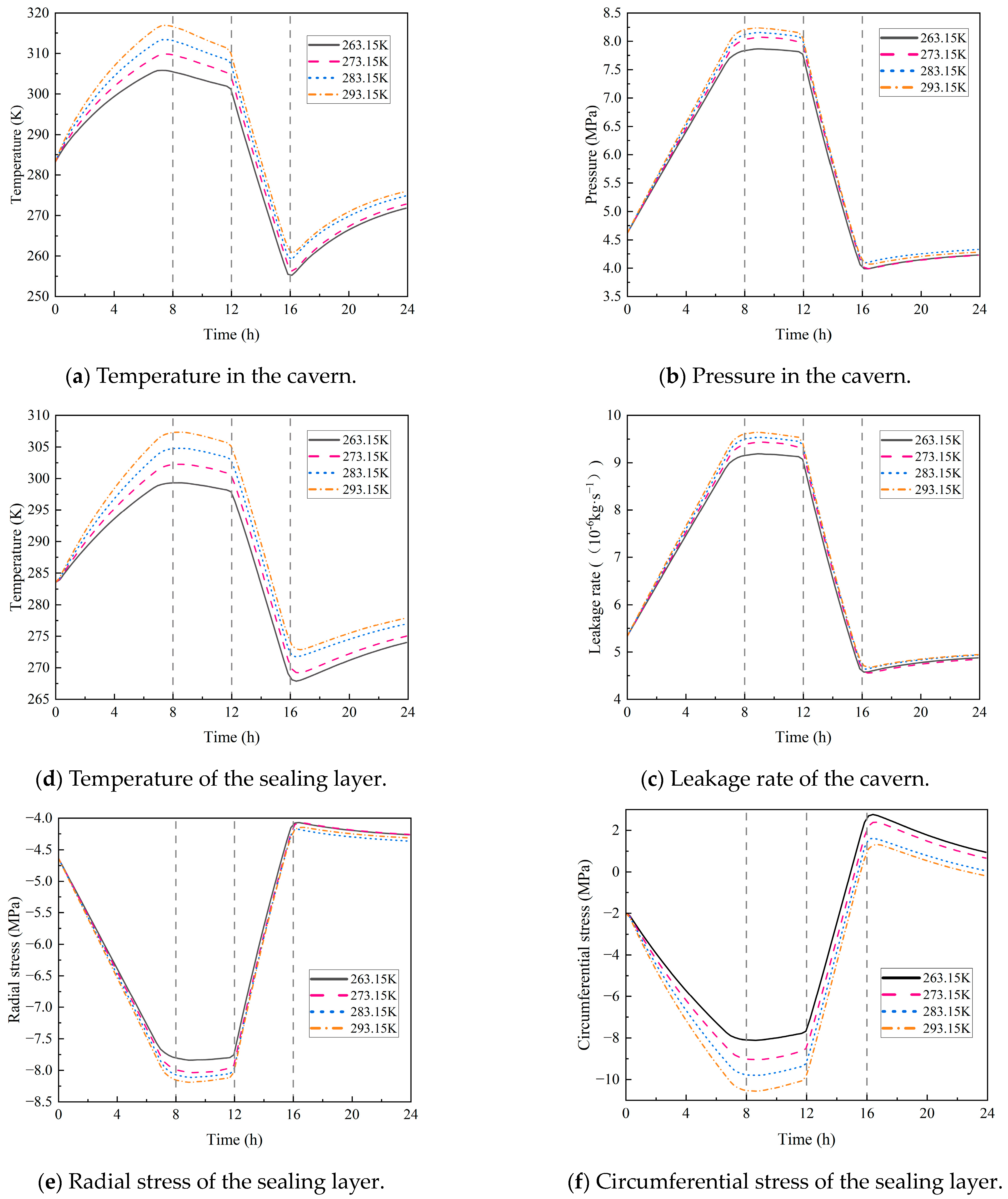 - Both the initial temperature of the storage and the hydrogen injection temperature have a significant impact on the circumferential stress of the sealing layer. For every 10 K increase in the initial temperature, the circumferential stress rises by 11%. For every 10 K increase in the injection temperature, the circumferential stress increases by 10%, with little impact on the leakage rate. In addition, the initial pressure of the storage and the hydrogen injection rate exert a considerable influence on airtightness. Each 1 MPa increase in the initial pressure causes the leakage rate to rise by 11%, and every 20 kg/s increase in the injection rate leads to a 12% increase in the leakage rate.