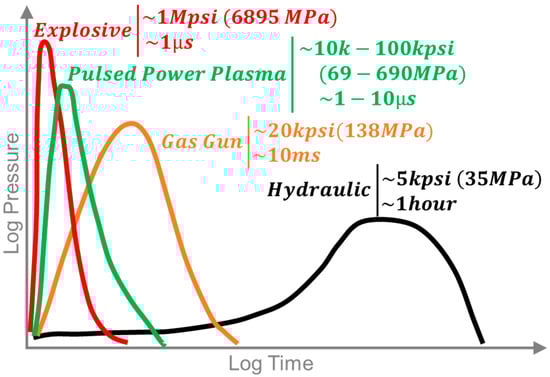 Figure 1 illustrates the key differences between 3PS and other rock stimulation techniques, including HF, gas gun, and explosives, each with distinct pressure profiles and energy delivery times. HF applies pressure gradually, reaching around 5000 psi (34.5 MPa) over an hour [27], promoting fracture growth along existing strata but requiring large water and proppant volumes, raising issues like groundwater contamination and induced seismicity. The extended duration also leads to thermal and pressure losses, reducing effectiveness in unconventional rocks.