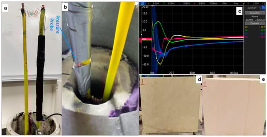Copper electrodes, bridged by the NP fluid, were paired with a needle probe piezoelectric hydrophone for real-time measurements of high-frequency ultrasound and shockwave pressures in the liquid medium (Figure 10b), enabling precise capture of transient dynamics (rise time ≈ 50 ns, sensitive diameter < 0.5 mm). The probe features a maximum pressure to 145,000 psi (1000 MPa). Calibration was performed using shock wave standards in water, with traceable sensitivity verified up to 290 psi (2 MPa) and constant response confirmed up to 4640 psi (32 MPa). Above this range, sensitivity is extrapolated based on material linearity and historical validation in high-pressure lithotripsy fields. Measurement uncertainty is estimated at ±5% within the calibrated range to 4640 psi (32 MPa) due to minor nonlinearities in response under extreme compression. Beyond 4640 psi (32 MPa), uncertainty rises to ±10%, reflecting reduced empirical validation but supported by consistent performance in prior high-energy shock wave studies. This integrated probe-electrode system was inserted through sealed feedthroughs in the true triaxial cell platens (Figure 10c) to prevent fluid leakage, electrical arcing, and pressure loss, ensuring safe and reliable operation.