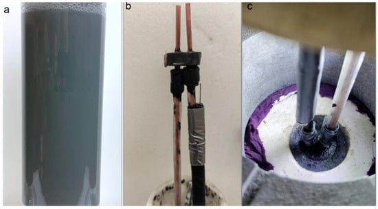 The innovated fluid for NP-3PS: (a) Mixture of NP in KCl + guar + deionized water; (b) Design of new electrodes; (c) Centralized electrodes in NP fluid in borehole before experiment.