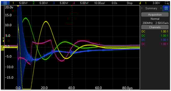 Voltage, current, pressure, and electromagnetic (EM) waveforms were simultaneously recorded using synchronized oscilloscope channels (Figure 9d). Signals were digitized at a sampling rate of 10 MS/s (0.1 μs resolution) via a oscilloscope, enabling capture of voltage, current signals and peak pressures up to 145,000 psi within pulse durations of 20–80 μs. This high temporal resolution was critical for resolving the rapid rise times (<1 μs) of plasma discharge events and distinguishing multi-cycle shockwave behavior from single-cycle wire-based discharges. Multiple EM sensors were positioned around the specimen to track plasma discharge propagation and field distribution (Figure 9a). Thus, this integrated measurement approach enabled detailed analysis of energy transfer efficiency and dissipation mechanisms, plasma channel stability and structure, as well as the amplitude and frequency characteristics of shockwave propagation.