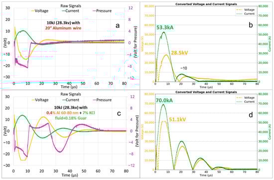 Furthermore, Figure 6 and Figure 7 provide a detailed comparison of electrical and mechanical responses during 3PS using the conventional Al wire versus the innovative Al NP fluid, both tested under a 10 kJ discharge at an initial charging voltage of 28.3 kV.