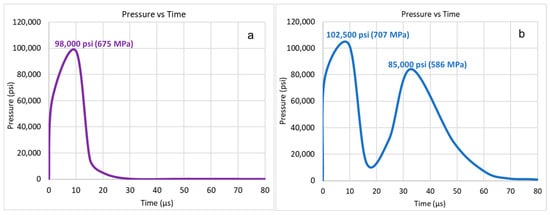 Pressure measurements, shown in Figure 16, corroborate these findings. The pressure-time curve for this configuration exhibited the highest recorded peak pressure of approximately 103,000 psi (710 MPa) within 10 µs, followed by a distinct secondary spike of 43,000 psi (296 MPa). The initial sharp peak reflects the instantaneous release of plasma-generated energy, while the secondary peak is attributed to explosive fluid expansion into the newly created fracture network. This two-stage pressure response indicates a transition from localized plasma-induced stress to distributed hydraulic expansion, effectively amplifying fracture propagation. The calculated stimulation efficiency of 2.07 under these conditions underscores the strong energy transfer from electrical discharge to mechanical deformation.