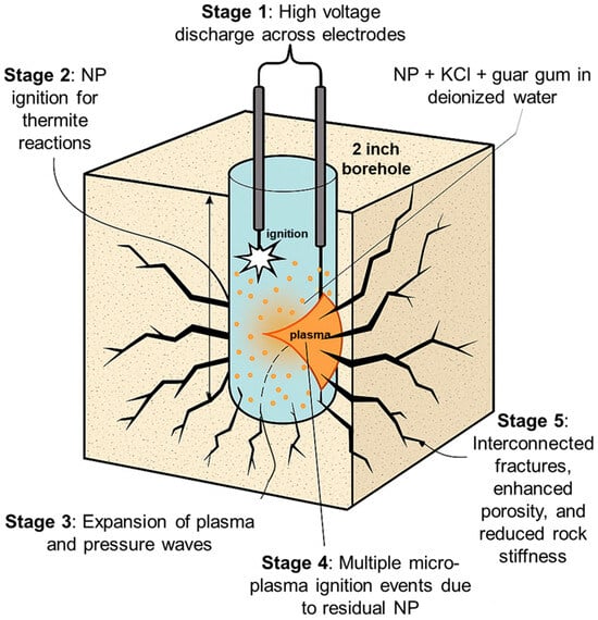 Pulsed power plasma stimulation (3PS) advances beyond traditional PAED, generating robust plasma that triggers an intense thermite reaction [18,26]. This involves placing a fusible link or metallic powders, often aluminum (Al), between underwater electrodes to enhance the electrical discharge. The reaction between ionized Al and water creates a highly exothermic process, potentially amplifying energy release severalfold [18]. Unlike HF’s bi-wing fracture patterns, 3PS fosters numerous micro-fractures linked to existing fissures, greatly enhancing rock permeability.