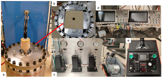 The NP-3PS experiments were conducted at the University of Houston using a custom-built high-voltage discharge system (Figure 9). The setup consisted of a 20 kJ, 40 kV capacitor bank (Figure 9a) capable of generating controlled electrical discharges into rock specimens. A remote-controlled interface with a dual-button interlock system ensured safe operation at high voltage (Figure 9e). Real-time electrical signals were captured using a high-speed digital oscilloscope (Keysight Technologies, Colorado Springs, CO, USA) (Figure 9d).