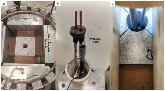 The NP-3PS experimental setup for the Granite rock: (a) Cube named G2 in the triaxial cell with EM sensors; (b) Secured electrodes with pressure probe; (c) Centralized electrodes in borehole of rock.
