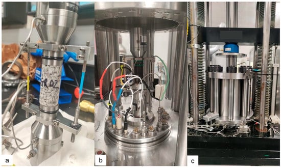 The setup for Geomechanical measurement: (a) Pre-3PS 1” × 2” (2.54 cm × 5.08 cm) cylindrical core plug (from G2 Granite cube); (b) Installation showing sensors and cable connections; (c) Fully enclosed triaxial cell system for geomechanical testing.