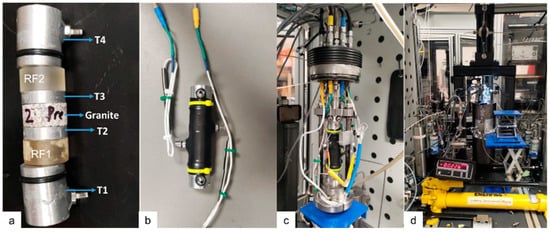A laboratory-scale axial heat flow apparatus was employed to determine the thermal conductivity of the granite core. The system configuration included a central granite specimen sandwiched between two reference materials (RF1 and RF2, each 0.503 in in length and 1.003 in in diameter) of known thermal conductivity (kr = 1.38 W·m−1·K−1). To monitor the axial temperature profile, four thermocouples were embedded along the central axis: