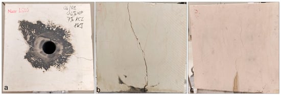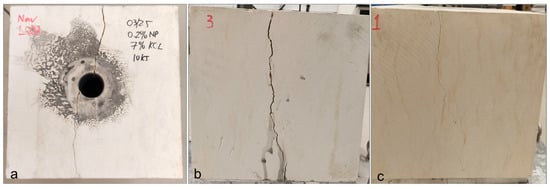 The first set of NP-3PS trials employed 4 wt% KCl solutions to examine the interaction of NP concentration and discharge energy (8–10 kJ) on rock fracturing. NP were dispersed with 0.18 wt% guar gum at concentrations of 0.15 and 0.4 wt%. Despite careful control of borehole geometry and electrical input, no visible fractures were produced at these conditions (Figure 13). Energy recovery values were near unity, indicating that the applied input was not effectively converted to mechanical work. These results suggest that the conductivity provided by 4 wt% KCl was insufficient to sustain plasma energy levels necessary for fracture initiation, independent of NP dosage or energy level. Surface inspections confirmed this trend: specimens with 0.15 wt% NP (Figure 13a–c) and 0.4 wt% NP (Figure 13d–f) exhibited no cracking, spalling, or fluid losses. This absence of macroscopic or microscopic failure highlights that plasma intensity was inadequate to nucleate fractures when paired with relatively low ionic strength.