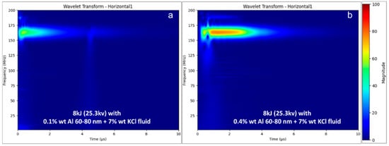 EM wavelet transforms 8 kJ discharge in 7 wt% KCl + 0.18 wt% guar fluid: (a) 0.1 wt% NP showing low-magnitude signals; (b) 0.4 wt% NP exhibiting sustained high-frequency activity.