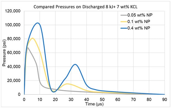 Pressure profiles comparing NP-3PS responses under 8 kJ discharge energy in 7 wt% KCl + 0.18 wt% guar fluid.