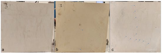 Absence of visible fractures on top and side views following NP-3PS experiment under 10 kJ discharge energy using 0.15 wt% NP + 4 wt% KCl + 0.18 wt% guar fluid: (a) Top view with red-marked T of new concrete C4; (b,c) Side views of facet 3 and 4; 0.4 wt% NP + 4 wt% KCl + 0.18 wt% guar fluid: (d) Top view with red-marked T of new concrete C6; (e,f) Side views of facet 3 and 4.