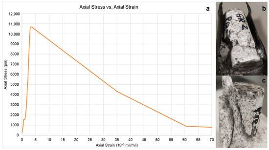 Mechanical characterization was performed using triaxial compression tests on 1” × 2” (2.54 cm × 5.08 cm) cylindrical plugs (Figure 11a). Strain gauges and pressure transducers were installed to monitor axial and radial deformation during loading (Figure 11b), with the specimens enclosed in a sealed chamber to maintain consistent boundary conditions (Figure 11c). These tests provided insight into the residual strength and elastic behavior of the stimulated rock.