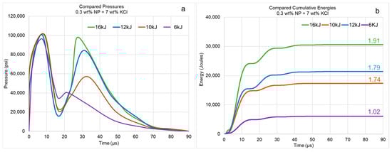 To isolate the effect of NP concentration, subsequent experiments used 7 wt% KCl while varying NP from 0.05 to 0.4 wt%. At low loadings (0.05–0.1 wt%) and 8 kJ discharge, no fractures were detected. Pressure peaks reached 65,000–80,000 psi (448–551 MPa) within microseconds, yet the plasma signatures remained short-lived and low in magnitude, reflecting weak energy coupling. Efficiencies ranged from 0.98 to 1.39, indicating negligible stimulation.