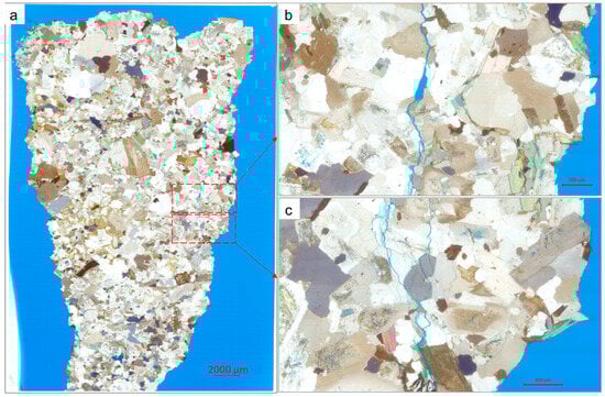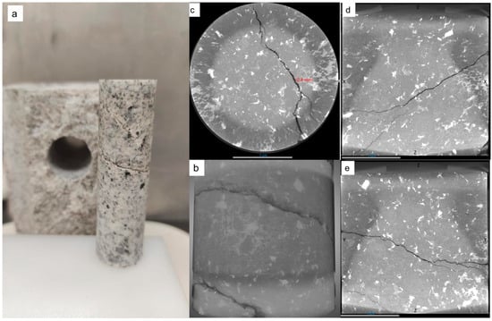 The baseline thermal conductivity of intact granite was measured at 2.61 W/m·K, reflecting the dense, low-porosity crystalline matrix typical of hot dry rock reservoirs. Following 16 kJ stimulation, the horizontal core plug—drilled perpendicular to the dominant fracture plane—exhibited a modest 9% decrease to 2.38 W/m·K, attributable to limited radial microcracking that introduced minor convective pathways without substantially disrupting axial conduction. In contrast, the vertical core, aligned parallel to the primary oblique fracture network, displayed a more pronounced 16% reduction to 2.18 W/m·K, consistent with enhanced void connectivity and increased tortuosity along the propagation direction, as corroborated by CT-derived fracture volumes (0.6–0.9 cm3) and apertures (100–300 μm).