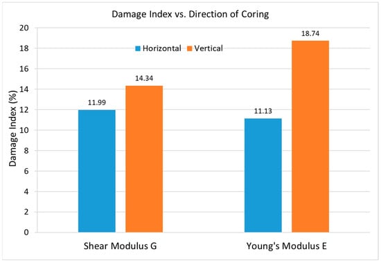 Dynamic acoustic properties of granite cores were assessed to evaluate the potential impact of NP-3PS on elastic behavior and fracture-induced weakening, which aligns with the study’s objective to characterize post-stimulation geomechanical changes. Initial measurements were performed on a pre-NP-3PS vertically drilled core using a pulse-receiver system with piezoelectric transducers, capturing compressional (Vp) and shear (Vs) wave velocities through high-speed oscilloscope recordings synchronized with plasma discharge events. Since horizontal directional properties were unavailable from direct pre-stimulation sampling, conversion models from [40,41] were utilized, providing a framework for geomechanical anisotropy and an empirical model to derive horizontal equivalents from vertical dynamic parameters based on elastic symmetry. Following NP-3PS, cores were drilled vertically and horizontally to facilitate respective measurements and comparisons.