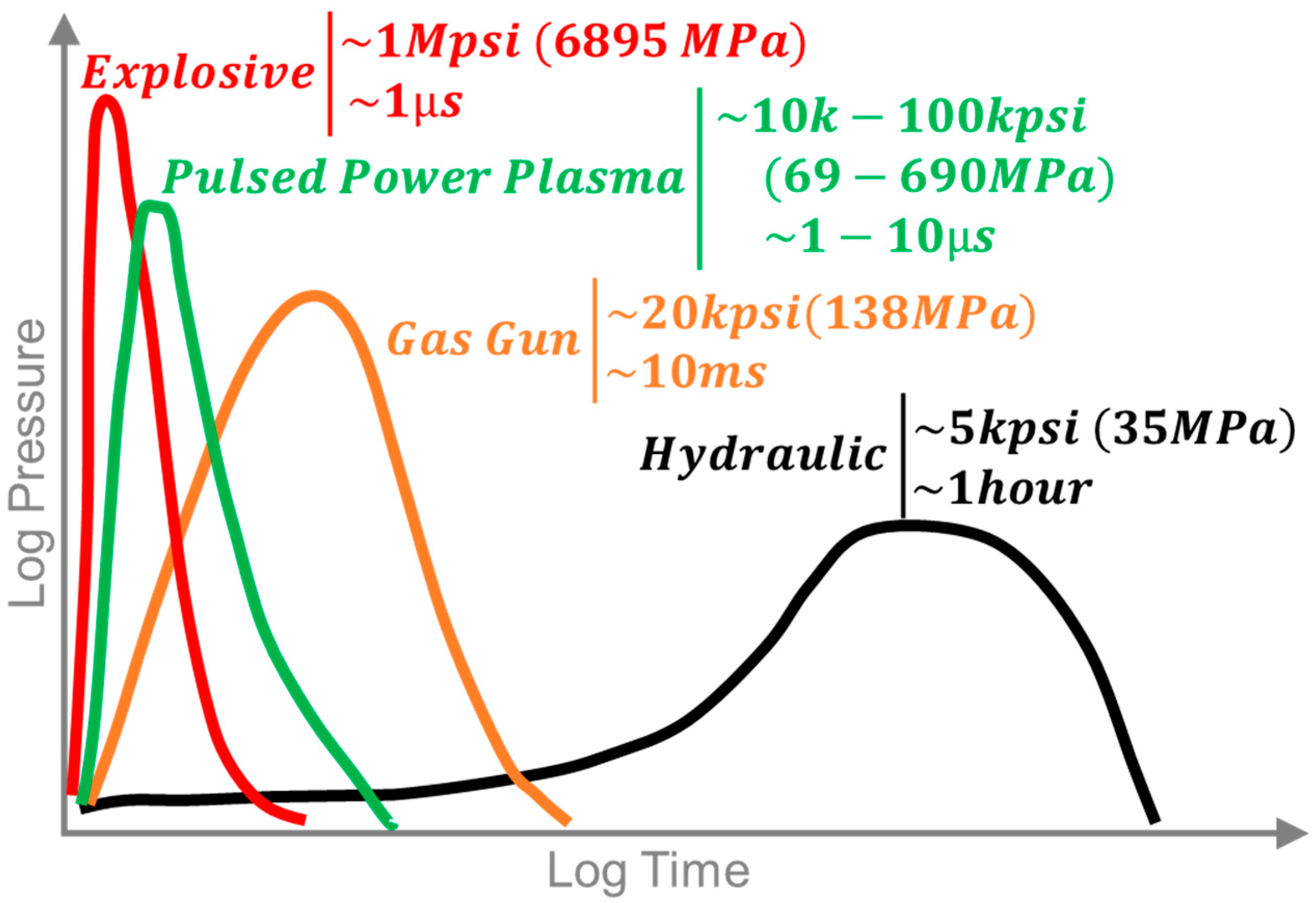 - Han, R.; Zhou, H.; Liu, Q.; Wu, J.; Jing, Y.; Chao, Y.; Zhang, Y.; Qiu, A. Generation of electrohydraulic shock waves by plasma-ignited energetic materials: I. Fundamental mechanisms and processes. IEEE Trans. Plasma Sci. 2015, 43, 3999–4008. [Google Scholar] [CrossRef]