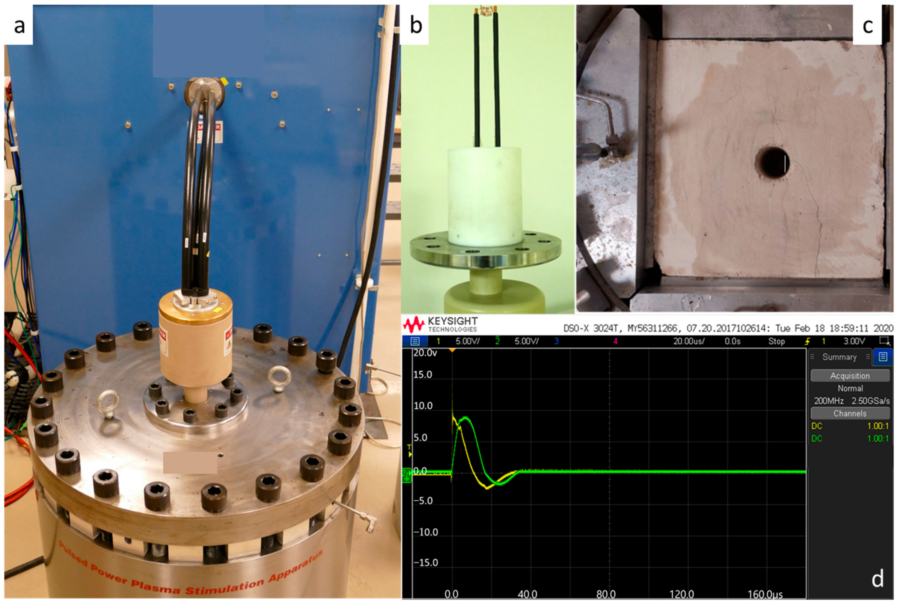 - Rezaei, A.; Siddiqui, F.; Callen, N.; Gordon, P.; House, W.; Soliman, M.Y. Pulsed Power Plasma to Enhance Near Wellbore Permeability and Improve Well Performance. In Proceedings of the SPE Hydraulic Fracturing Technology Conference and Exhibition, The Woodlands, TX, USA, 4–6 February 2020. [Google Scholar] [CrossRef]
