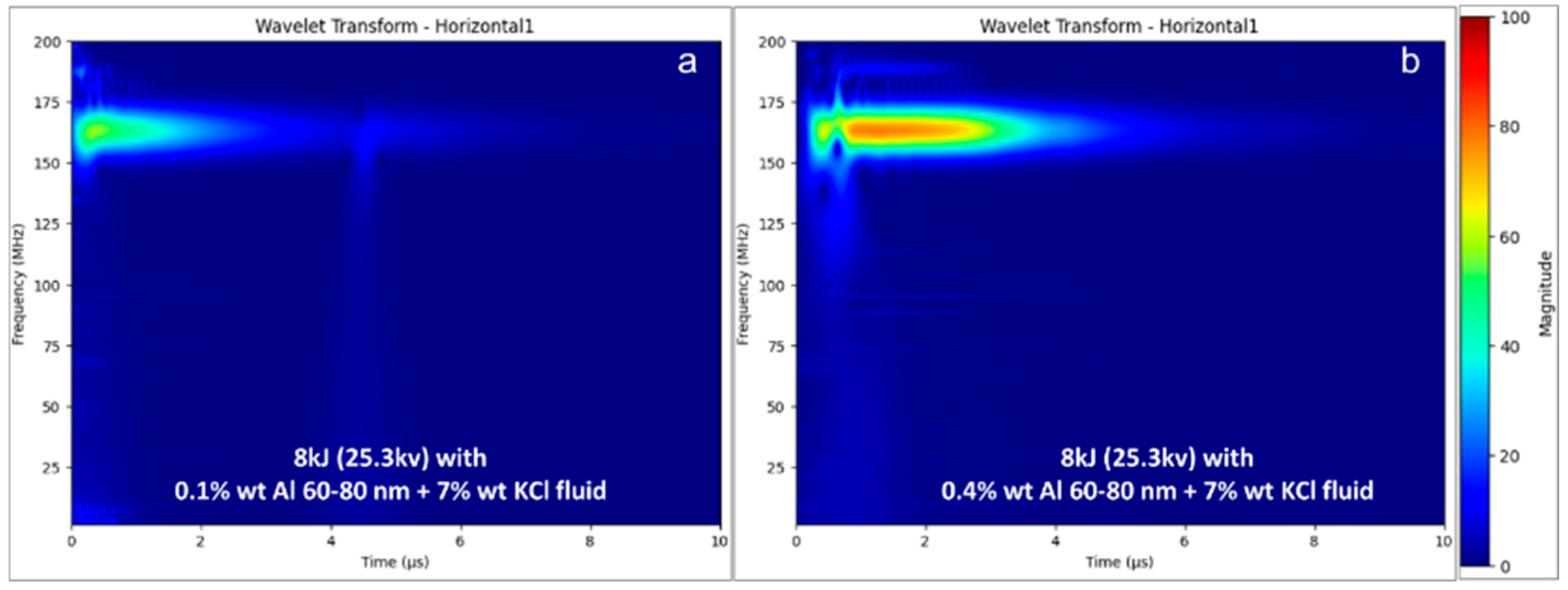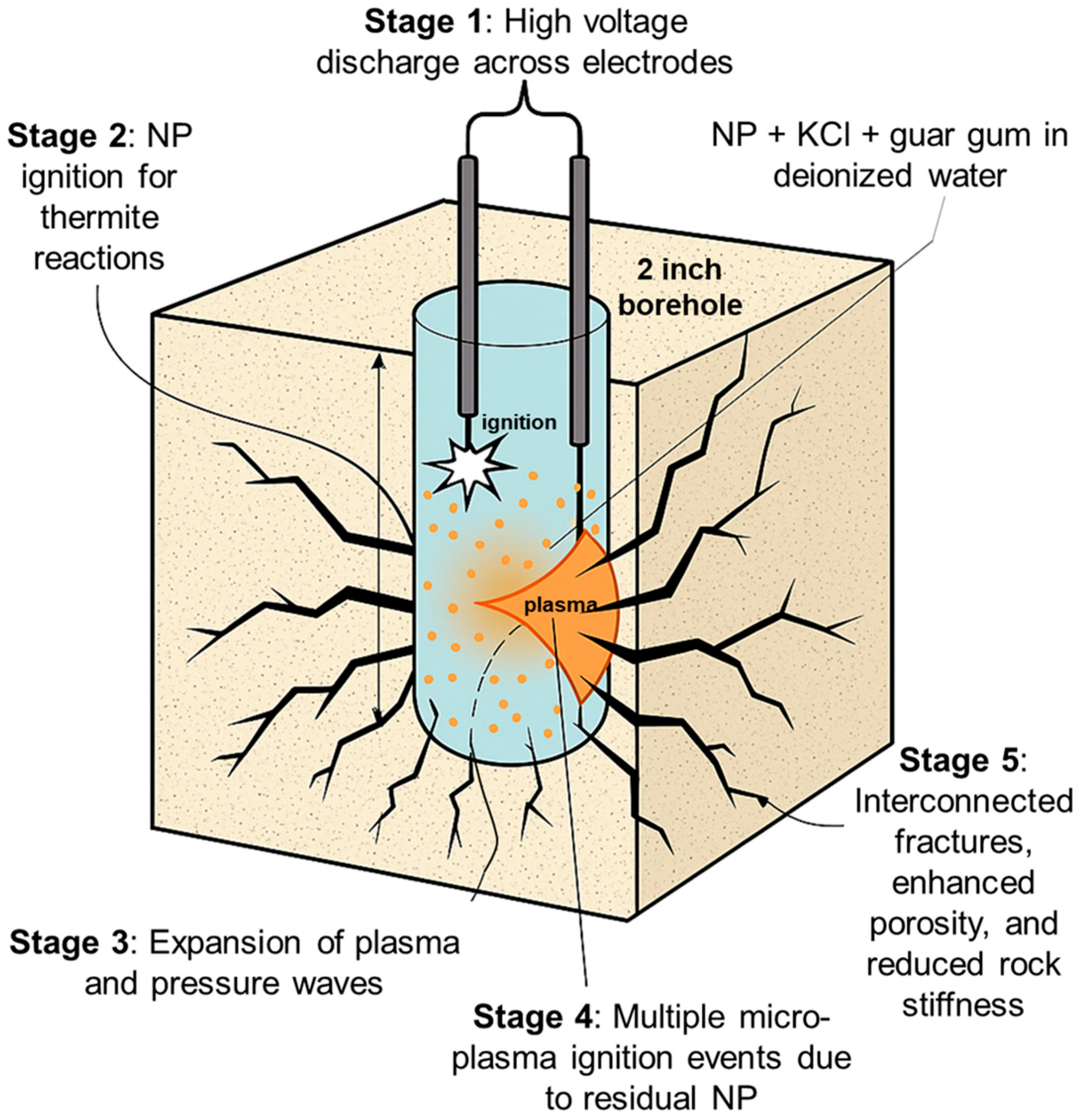 - KCl served as the ionic base of the NP fluid, providing both high conductivity and physicochemical stability under high-temperature, high-salinity geothermal conditions. Although clay stabilization is not a primary concern in crystalline geothermal reservoirs (unlike in conventional operations where KCl prevents clay swelling and permeability loss [44,45]), its inclusion here maintains ionic strength, ensures stable electrochemical pathways, and promotes consistent plasma channel formation and sustained thermite reactions between NPs. This KCl (Nutricost Manufacturing, LLC., Utah, USA) conductive environment enhances electron mobility across the discharge gap, accelerating plasma initiation and strengthening electro-mechanical energy coupling during NP-3PS events.