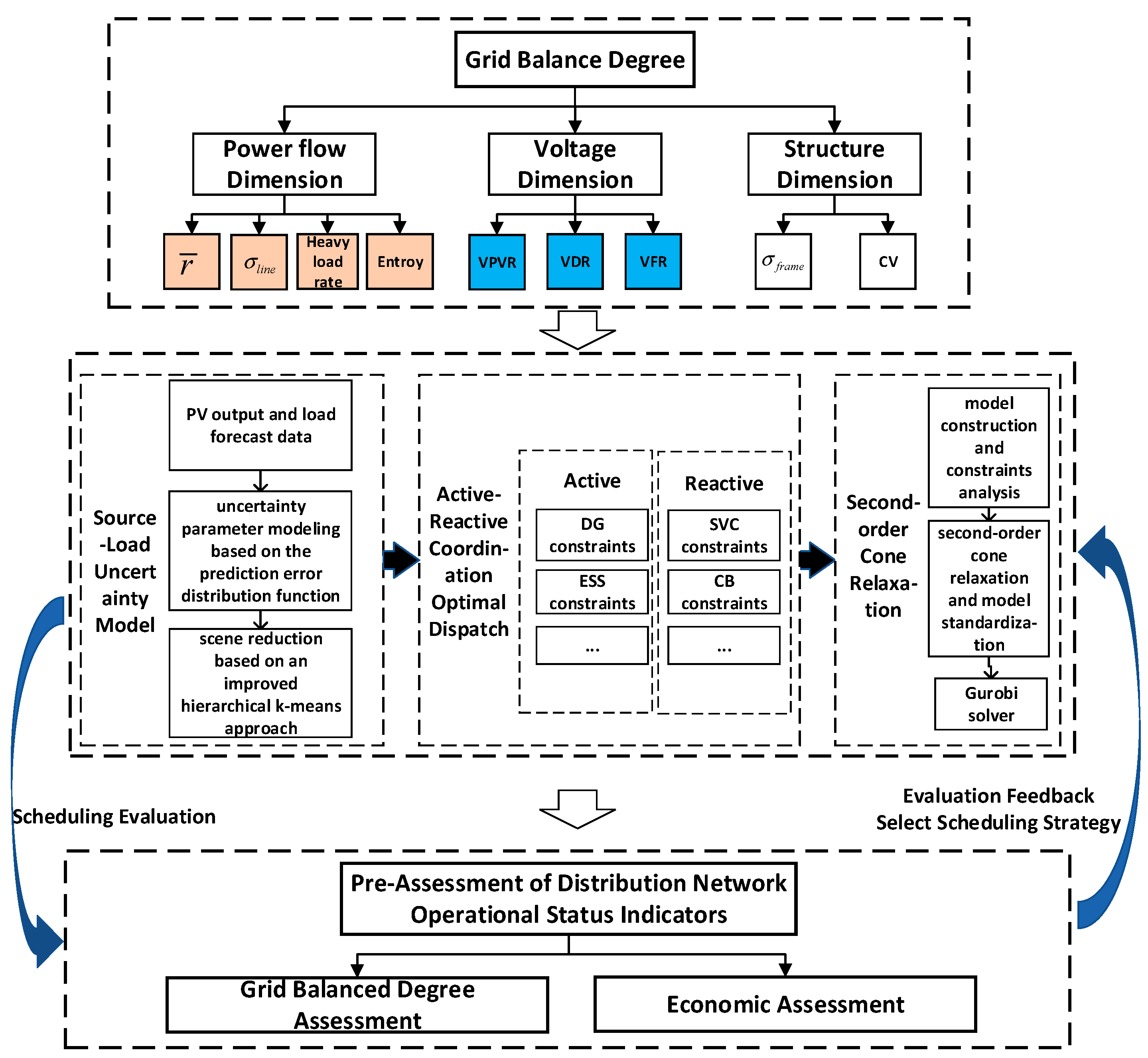 - A coordinated active/reactive power optimal dispatch strategy incorporating GBD is proposed. Including load factor penalties in dispatch objectives, it guides balanced power flow distribution across lines, prevents heavy line load or overloading, and enhances GBD in the power flow dimension. Adjusting the voltage upper/lower limits modifies GBD in the voltage dimension. Network restructuring can adjust GBD at the structure level. Integrating reactive power compensation devices, ESS, and DR resources enhances GBD and the operational reliability of ADN; delays equipment aging; and extends the equipment lifespan. Combining the dispatch method with operational state pre-assessment indicators quantifies the costs and benefits of high-quality grid operation, enabling dispatchers to select scheduling schemes with varying reliability levels.